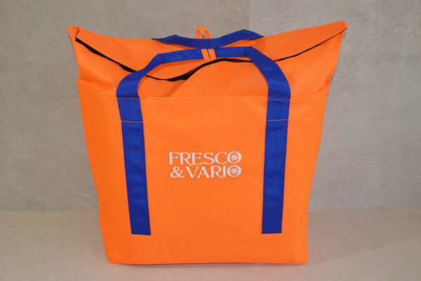 Borsa termica in tessuto resistente e lavabile. Può contenere e trasportare fino ad un peso di oltre 10 kg di merce mantendendo bene la temperatura. Se all'interno si mettono dei siberini o una bottiglia di acqua ghiacciata la borsa termica aumenta ancora la sua capacità di trattenere il freddo.