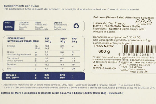 Salmone Scozzese preaffettato senza pelle dalle carni affumicate delicate dal sapore raffinato. Ottimo da gustare servito su del pan carrè caldo tostato con del buon burro, oppure come antipasto con un insalata mista o delle verdure cotte stagionali a piacere. Ottimo anche per farcire crespelle e tramezzini.