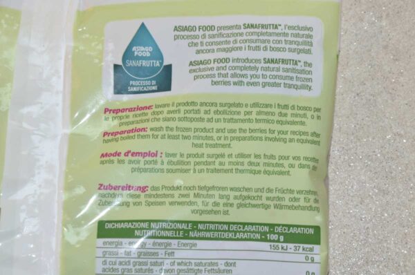 Frutti nobili del sottobosco Asiago. Raccolti al giusto grado di maturazione, in parte selvatici (more, mirtillo, si intuisce dal sapore) e in parte di coltivazione (lamponi e ribes). Surgelati IQF, selezionati e depicciolati; miscelati in proporzione per ottenere profumi e sapori bilanciati. Il mix di frutti ha colori e sapori tipici.
