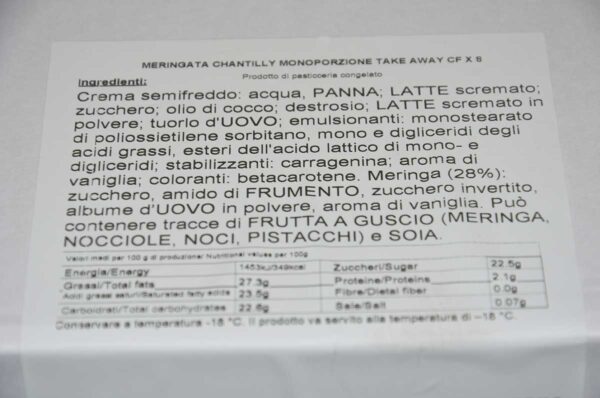 MERINGATA CHANTILLY TAKE AWAY 80 GR COD: 568514 Prezzo al kg 32,37 APRI ETICHETTA €2,59 / PZ Descrizione Meringata Chantilly monoporzione 80gr Temperatura di conservazione: -18C Potrebbero interessarti anche Aggiungi alla lista dei desideri CROISSANT CEREALI MIELE E AVENA (6PZ) 450GR € 3,69 /CF Prezzo al kg 8,20 VAI AL PRODOTTO Aggiungi alla lista dei desideri SEMIFREDDO YOGURT FRUTTI BOSCO 2PZ 180GR € 4,19 /CF Prezzo al kg 23,28 VAI AL PRODOTTO Aggiungi alla lista dei desideri TORTA SEMIFREDDO NOCCIOLA 1,2 KG € 14,9 /PZ Prezzo al kg 12,42 VAI AL PRODOTTO