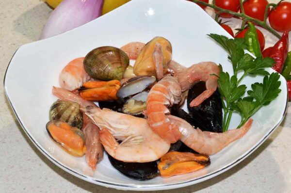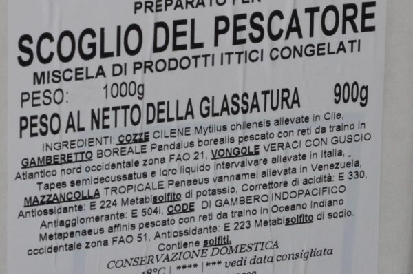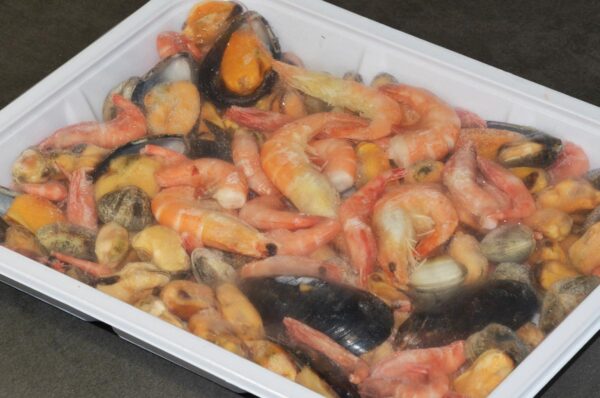 Misto di prodotti ittici congelati: cozze cilene sgusciate e a mezzo guscio, gamberetto boreale intero o gambero