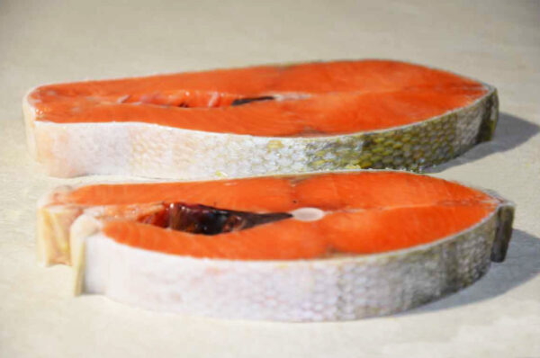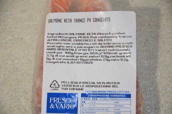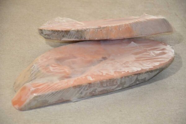 Salmone tagliato a trance con pelle, dal colore rosato e dalla pezzatura pressochè uniforme.Congelato e avvolto da una pellicola protettiva per conservarlo meglio.Le carni del salmone sono morbide, saporite e piuttosto ricche di grassi buoni, pieni di omega 3 che fanno bene al cuore.