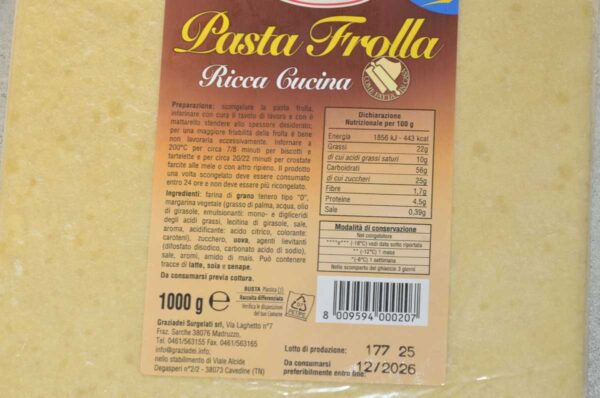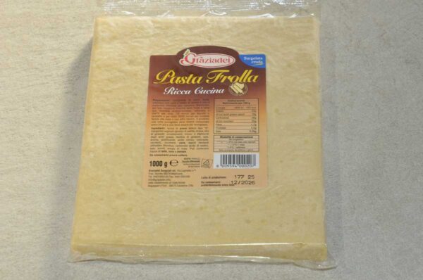 Panetto intero da 1 kg di pasta frolla.La pasta frolla firmata Graziadei dal sapore e croccantezza inconfondibili. La ricetta è infatti stata sviluppata dal titolare Giuliano Graziadei agli esordi della sua carriera da pasticcere, per poi essere perfezionata negli anni. Il sapore e la consistenza croccante vogliono ricordare quello della pasta frolla fatta in casa, adatta per la realizzazione di crostate, biscotti ed altre creazioni golose.