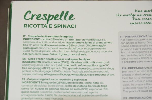 Ingredienti: ricotta 25(siero di latte, sale,correttore di acidità: acido citrico), latte scremato reidratato, farina di grano tenero tipo “0”, misto d’uovo di gallina pastorizzato 12%, spinaci 7%, Formaggio grattugiato, Fecola di patate, sale, Olio di semi di girasole, pepe, noce moscata.