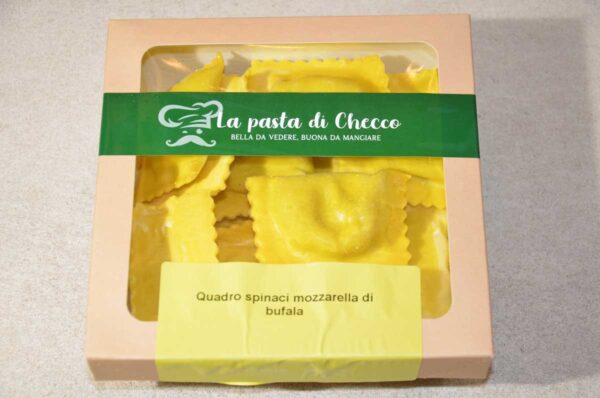 Pasta all’uovo preparata fresca congelata ripiena con mozzarella di bufala e spinaci.