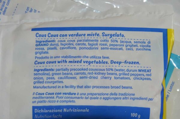 Cous cous parzialmente cotto 50% (acqua, semola di grano duro), fagiolini, carote, fagioli rossi, peperoni grigliati, cipolla rossa, piselli, cavolfiore, pomodorini semi-essiccati, ceci, zucchine grigliate. Può contenere tracce di SOIA. Prodotto in uno stabilimento che utilizza FAVE.