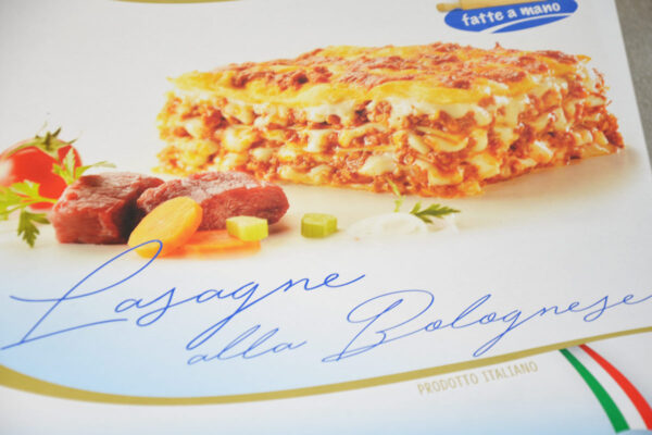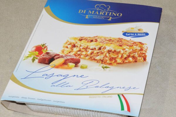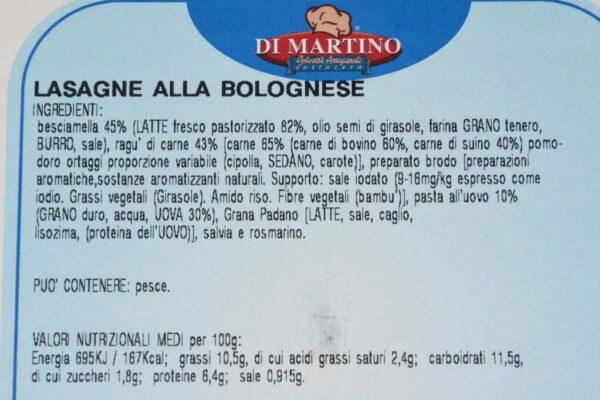Lasagne alla bolognese preparate con pasta di lasagna fatta con farina di grano tenero, semola di grano duro e uova fresche pastorizzate.Il ripieno è preparato con carne di bovino e di suino, pomodoro, olio di semi di girasole, cipolla, sedano, carote, burro, vino rosso, formaggio grattugiato, brodo. Le lasagne sono ottime e genuine poichè esprimono la freschezza di materie prime scelte lavorate artiganalmente.