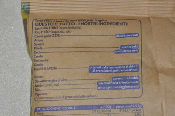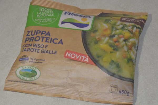 Zuppa proteica a base di lenticchie, riso e carote gialle surgelata. Da consumarsi previa cottura.