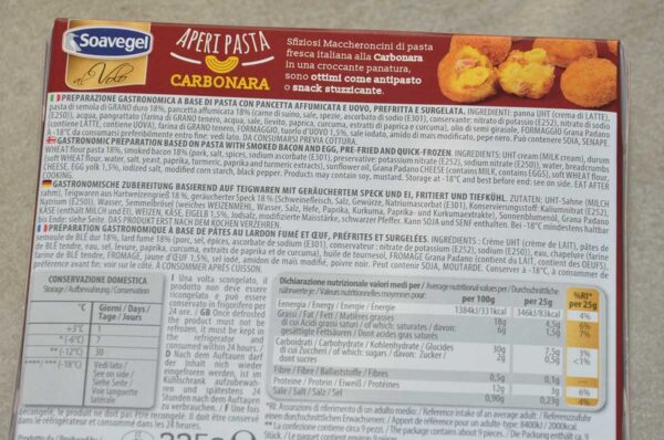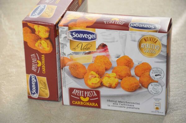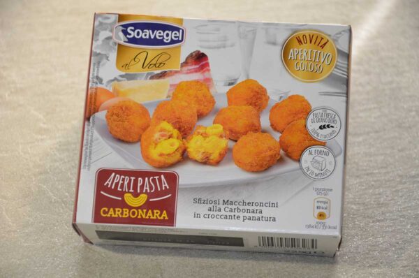 Sfiziosi maccheroncini alla carbonara in croccante panatura prefritti e surgelati da gustare caldi con un aperitivo.