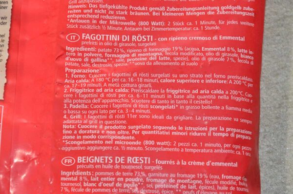 Il formaggio Emmental è perfettamente stagionato secondo la tradizione Svizzera, arricchito con cremosa besciamella e con un filo di panna delle Alpi, avvolto in una crosta di rösti croccante e precotto in olio di semi di girasole al 100%.