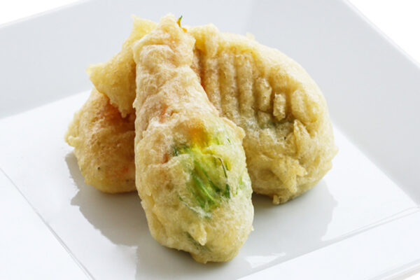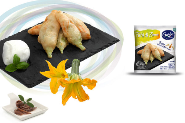 Fiori di zucca ripieni di alici e mozzarella pastellati, prefritti e surgelati pronti da cuocere in forno o in friggitrice velocemente per gustare un appetitoso cicchetto come antipasto o snack con i tuoi amici per un drink in compagnia.