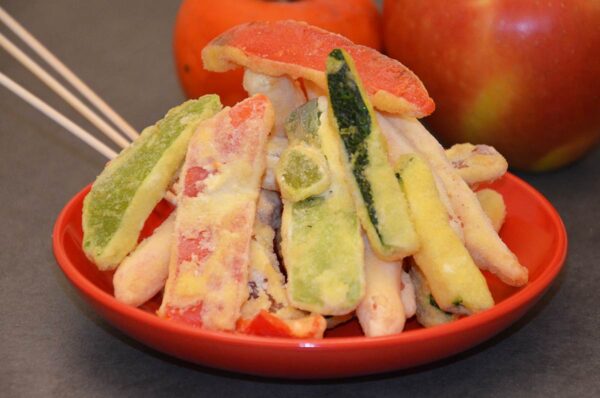 Misto di verdure pastellate prefritte: carote, cipolle, peperoni rossi e verdi, melanzane e zucchine.