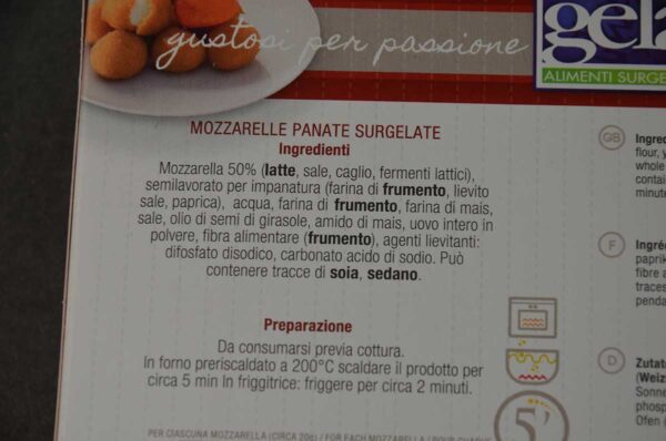 INGREDIENTI: mozzarella 50% (latte, sale, caglio, fermenti lattici), semilavorato per impanatura (farina di frumento, lievito sale, paprica), acqua, farina di frumento, farina di mais, sale, olio di semi di girasole, amido di mais, uovo intero in polvere, fibra alimentare (frumento), agenti lievitanti: difosfato disodico, carbonato acido di sodio.