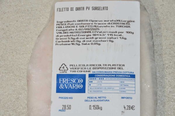 Filetti di orata taglia 120/160 g congelati in iqf. Squamati e deliscati si ricavano da orate allevate in Turchia.