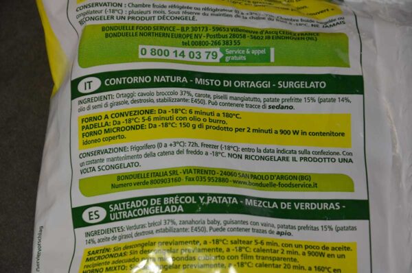 Misto di ortaggi: cavolo broccolo 37%, carote, piselli mangiatutto, patate prefritte 15%(olio di semi di girasole, stabilizzante: E450, destrosio). Può contenere tracce di sedano.