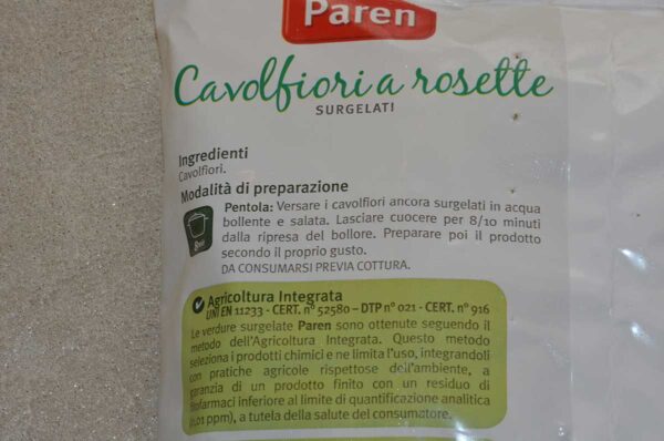 I cavolfiori Paren sono già stati lavati, selezionati, curati e surgelati in iqf. La consistenza soda e il sapore è naturale come il fresco; ottimi gratinati con pane e formaggio grattuggiato o cotti al vapore da condire a piacere.